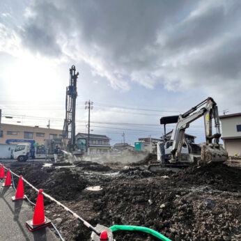 2026-02-05 柱状改良 by 向井 一比古 建物基礎を支える地盤改良工事が進んでいます。 地中1.5m下の支持地盤にφ600の円柱補強体を96本造り、建物を支えます。柱状改良のメリットは工期が短い、低コスト、幅広い基礎形状に対応と三拍子揃った地盤改良工法です。