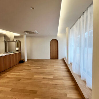 間接照明、建具上のアーチ開口、テーブル等を