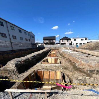 2025-09-17 基礎掘り方 by 向井 一比古 「笠松のオフィス」の定例会議に行って来ました。 基礎を造る為、地盤を建物の基礎の深さと形状に掘削する作業が進んでいます。コンパネで囲われ深く掘られて部分が、柱の基礎部分。地盤から3m下まで掘られ、迫力ある基礎工事です。