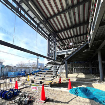 2025-12-12 エントランスホール by 番場美槻 「笠松のオフィス」は風除室から吹抜空間にかかる大階段を上がり2階オフィスに向います。 幅2mのスケルトン階段。階段左側は、ガラスカーテンウォールで明るく開放感あるエントランスになる予定です。