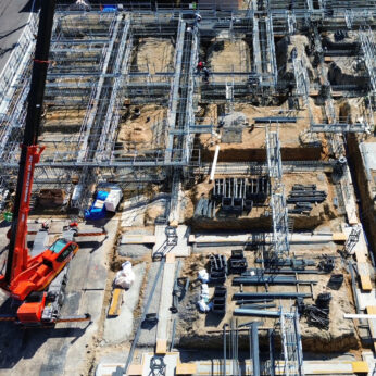 2026-02-25 上空35m by 渡邊 隆弘 各務原市に位置する「東門町ファクトリー」の現場は基礎工事を進行中です。 床面積が2,700㎡を超える大きなファクトリーなので基礎作業エリアを4工区に分けています。 上空35mから見た、1工区の基礎配筋。配筋上の地足場もあり、ヴォリュームとスケールのある工事風景です。 「上空35m」自衛隊基地にほど近いため「35m以上ドローンを飛ばすと撃墜されますよ!」と監督さんに助言されました。気を付けて飛ばします。